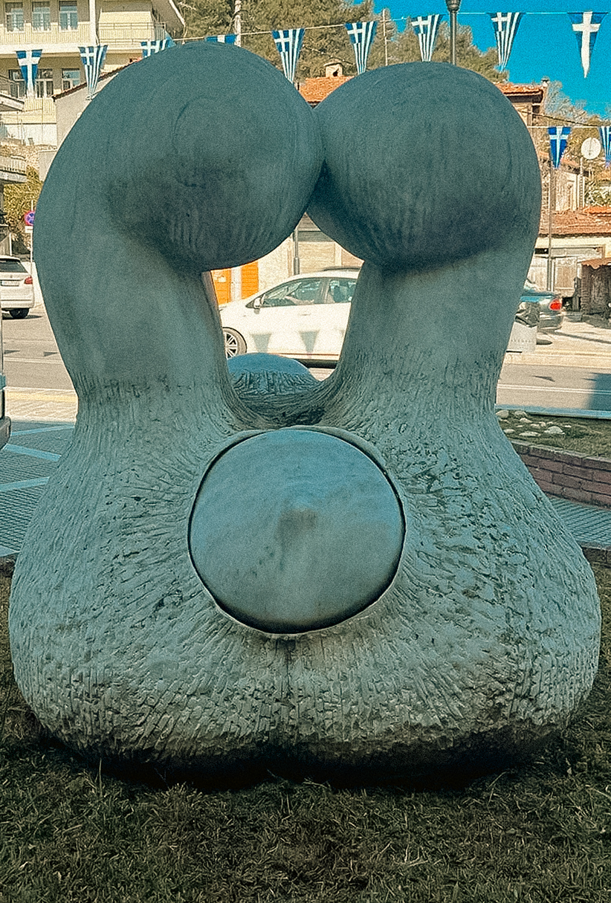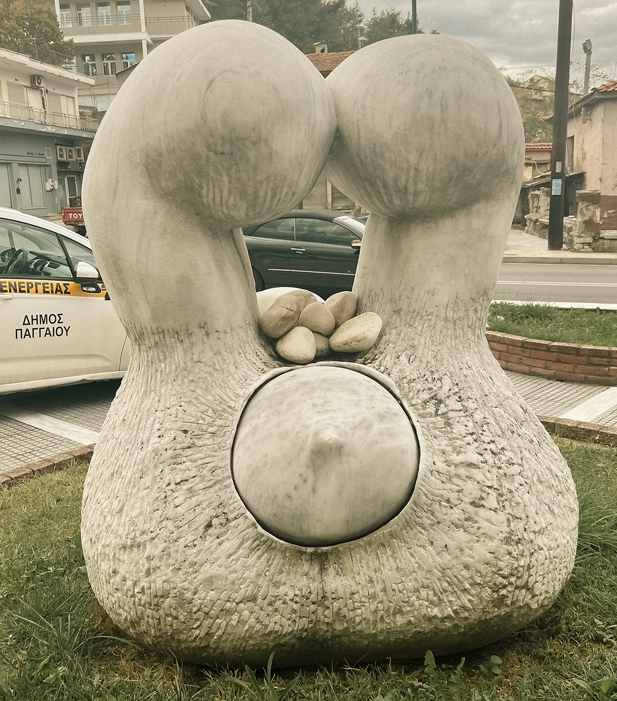 Στην κατάσταση που αρχικά αποτύπωσα το άγαλμα, στο κενό που δημιουργείται στο κέντρο του γλυπτού κάποιος είχε εναποθέσει μερικές λευκές κροκάλες. Κάνοντας έρευνα στους διαθέσιμους ηλεκτρονικά χάρτες στο διαδίκτυο (Google Maps) επιβεβαίωσα αφενός μεν την εγκατάσταση του γλυπτού στο σημείο από το έτος 2011 τουλάχιστον, αφετέρου δε την παρέμβαση με τις κροκάλες να έχει γίνει μετά το έτος 2019. Τα όσα διαπίστωσα είχα υποχρέωση βέβαια να επικοινωνήσω στον καλλιτέχνη, ο οποίος με ενημέρωσε ότι ήταν γνώστης της κατάστασης, αλλά με πληροφόρησε και για διάφορα άλλα γεγονότα, τα οποία αξίζει, θεωρώ, να μοιραστώ δημόσια.